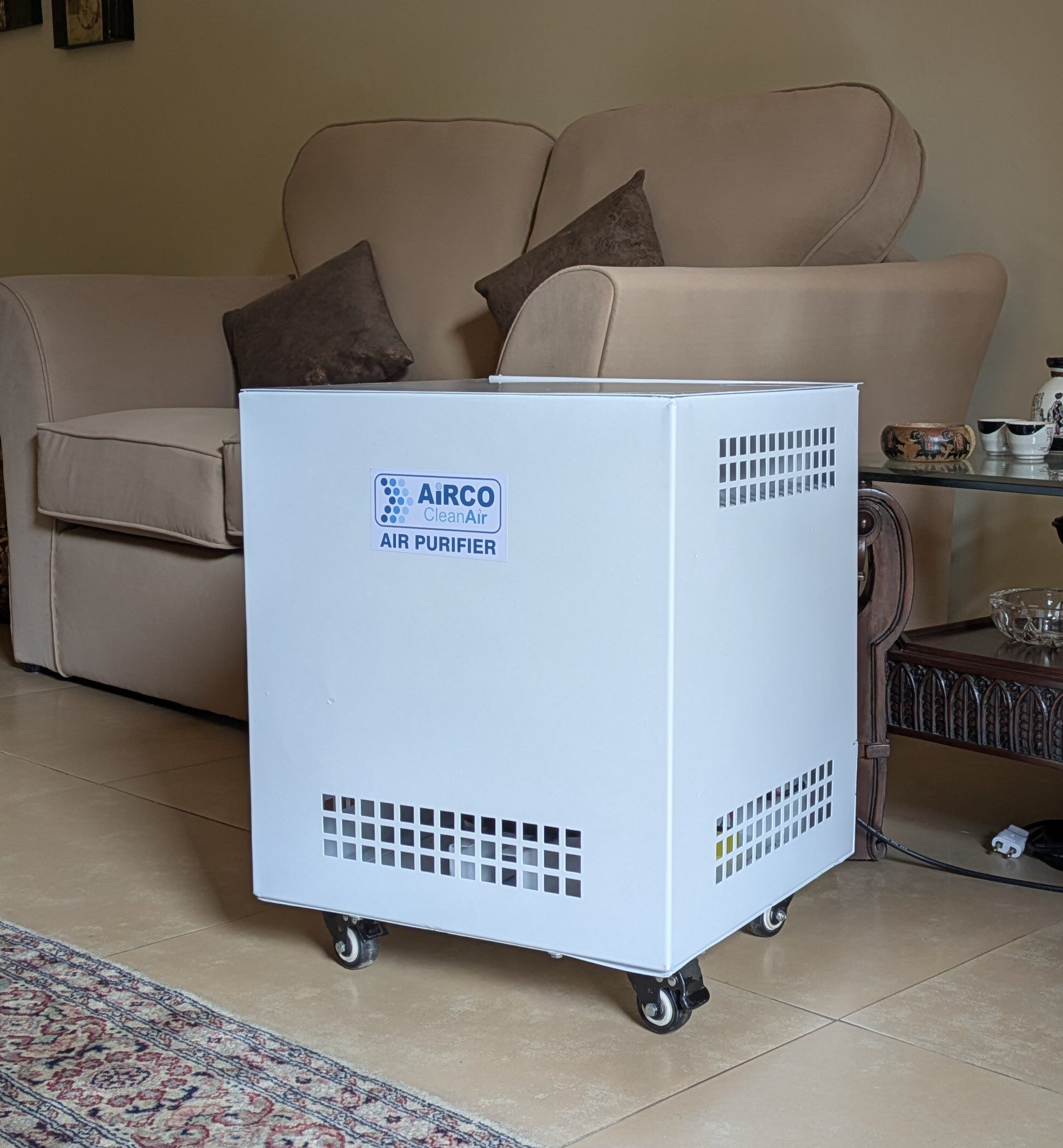AIRCO AIR PURIFIER help relieve symptoms of allergies and asthma by producing a unique “clean air pocket”. AIRCO, not only removes 99% of airborne pollutants 0.5 microns or larger, but also adsorbs harmful odors and gasses. Clean a large area – 650 square feet in less than an hour. Whisper quiet on the low setting for relaxing atmosphere. Airflow 600 CFM, Air Changes Per Hour (ACH) – 6 ACH in 6,000-7,500 cubic feet.